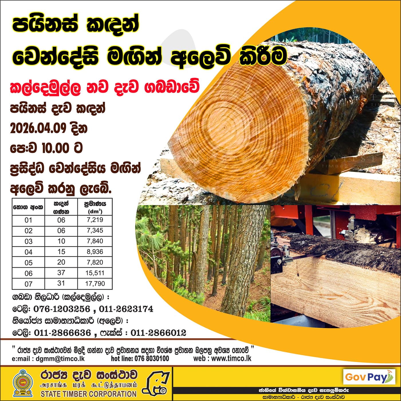 ඔබගේ සුවිශේෂී ව්යාපාරික දැව අවශ්යතා සපුර ගැනීම සඳහා මෛක්රෝ,ග්රාන්ඩිස්,පයිනස් ඇතුලු විවිධ පන්ති ඉරූ දැව තොග වෙන්දේසි මගින් මිලදී ගැනීමට අනගී අවස්ථාවක්